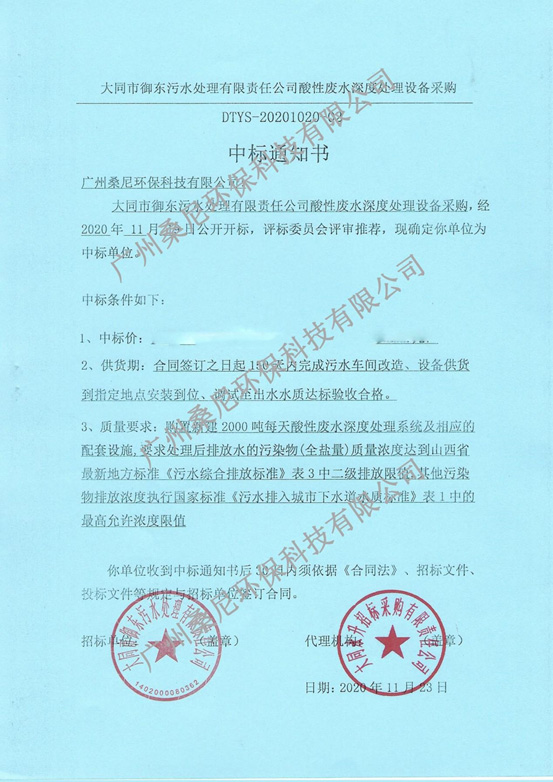 廣州桑尼環(huán)??萍加邢薰緟⑴c酸性廢水深度處理設(shè)備采購項(xiàng)目投標(biāo),以良好的信譽(yù)、豐富的經(jīng)驗(yàn)、強(qiáng)大的技術(shù)實(shí)力以及專業(yè)的方案、合理的報(bào)價(jià)贏得了招標(biāo)單位以及評標(biāo)專家的肯定,成功中標(biāo)。