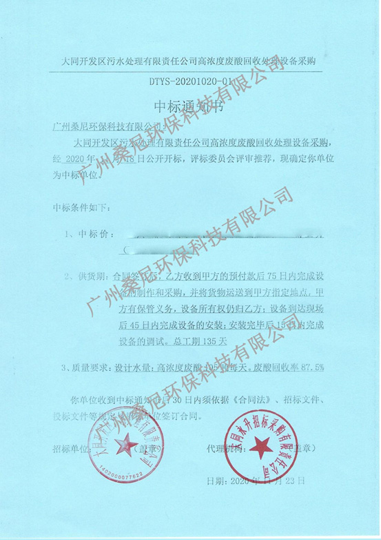 廣州桑尼環(huán)??萍加邢薰境晒χ袠?biāo)高濃度廢酸回收處理設(shè)備采購項(xiàng)目以良好的信譽(yù)、豐富的經(jīng)驗(yàn)、強(qiáng)大的技術(shù)實(shí)力以及專業(yè)的方案、合理的報(bào)價(jià)贏得了招標(biāo)單位以及評標(biāo)專家的肯定,成功中標(biāo)。